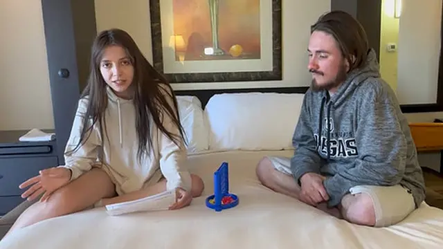 A sexy brunette rides his cock after a strip game of Connect 4 on the bed