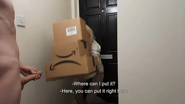 Nude teen delivery girl jerks off lucky guy and enjoys a doggy creampie