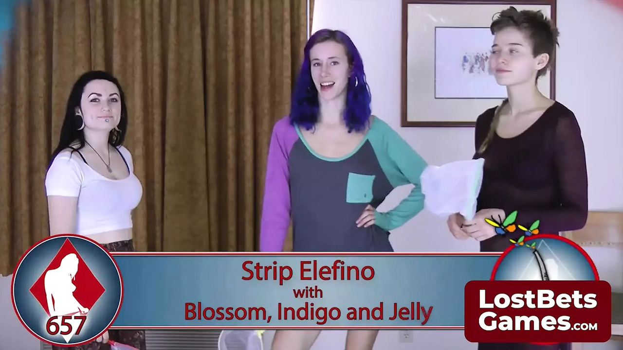 These three newbies—Indigo, Blossom, and Jelly—are diving into their first nude shoot, giggling and learning fast. Blossom, the shortest, starts at a disadvantage in their game of Elefino, but she catches up quickly. The winners aren't playing nice, though—straight for the underwear, leaving one girl utterly naked under her sheer dress, looking hot as hell.