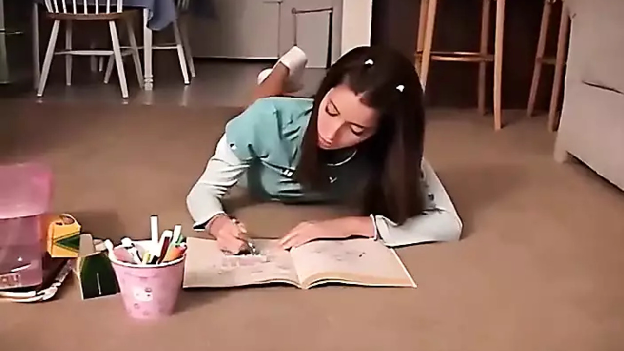 Cute 18-year-old American girl Chloe draws on paper while rubbing her clit through her panties. She's horny and moans as she masturbates, her tiny white tits bouncing slightly. She finally cums, drawing a smiley face on her paper.