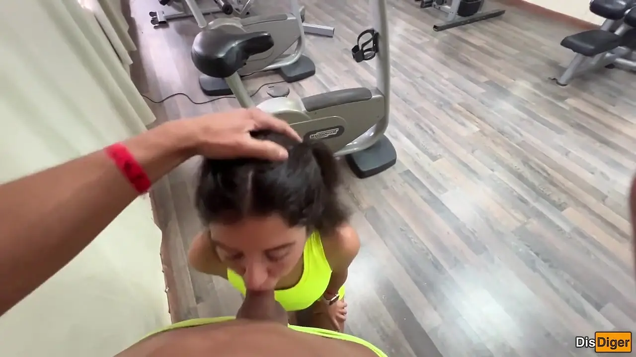 In the gym after hours, the skinniest personal trainer gets caught in a compromising position. He's gagging on her dick while she rides him hard, all tits bouncing. She swallows his cum at the end.